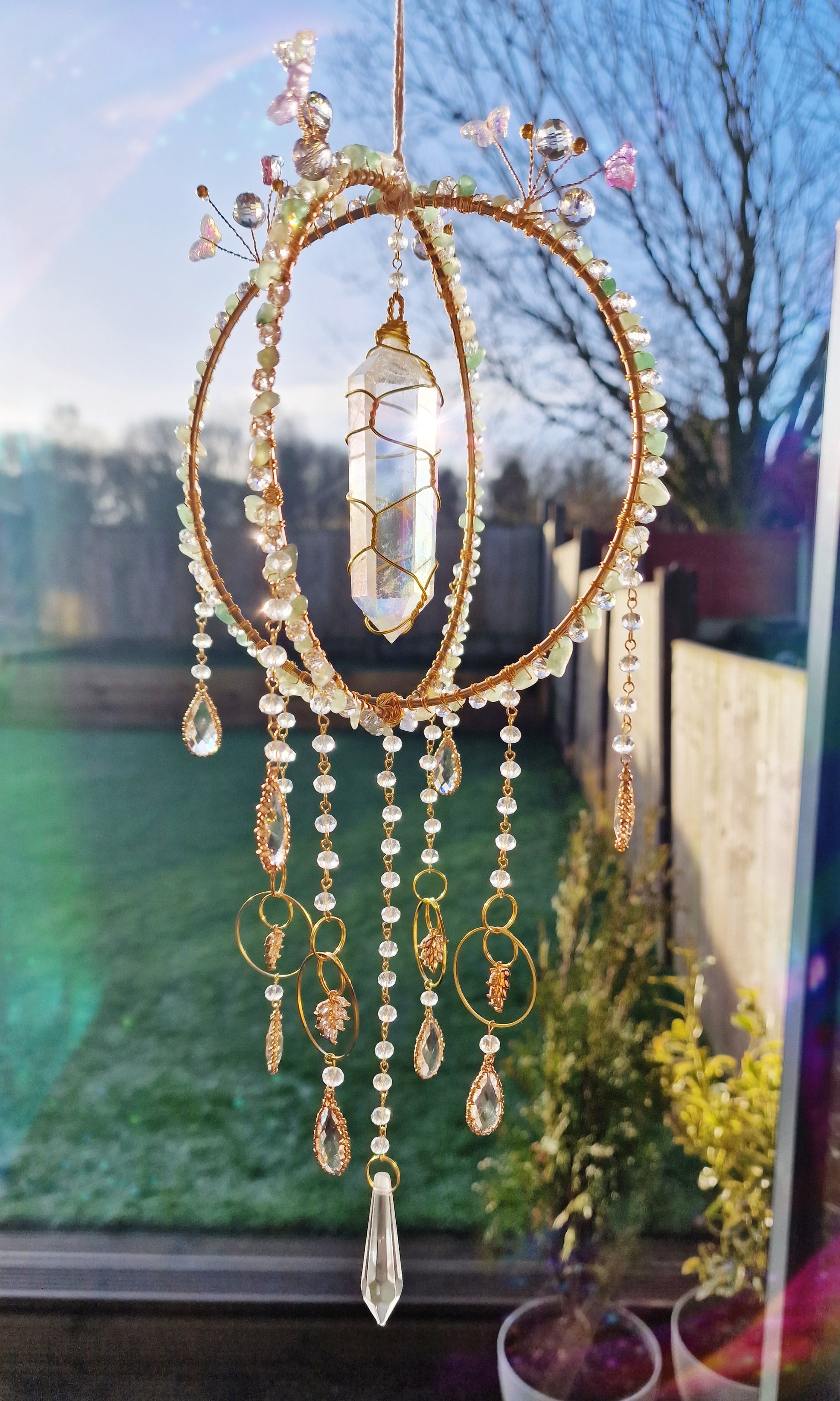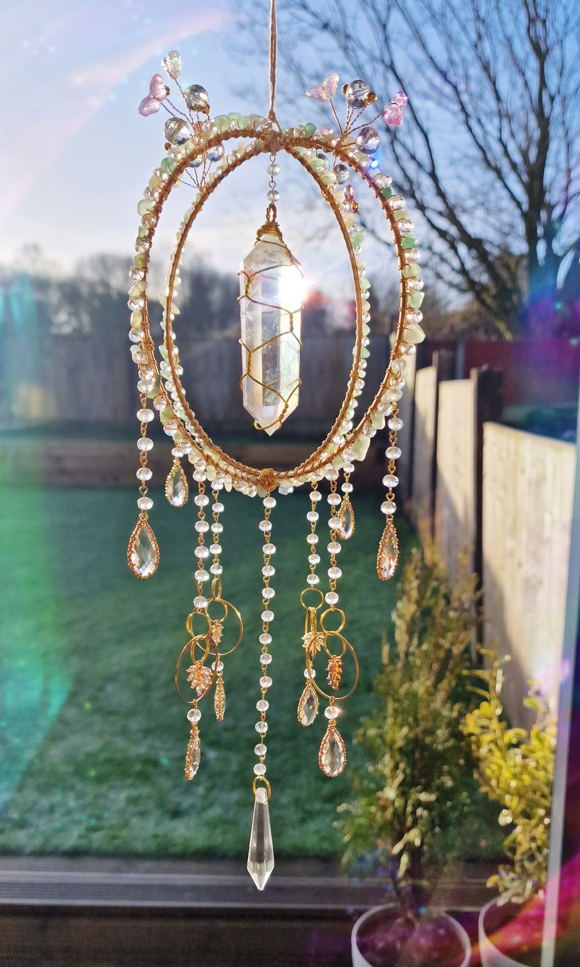 Invite luck, abundance, and fairy magic into your space with this Butterfly Fairy Suncatcher! 🦋✨ Designed for fairy lovers, crystal collectors, and spiritual seekers, this handcrafted suncatcher features a stunning aura quartz double-pointed crystal, delicate butterfly charms, and energizing aventurine chip beads.