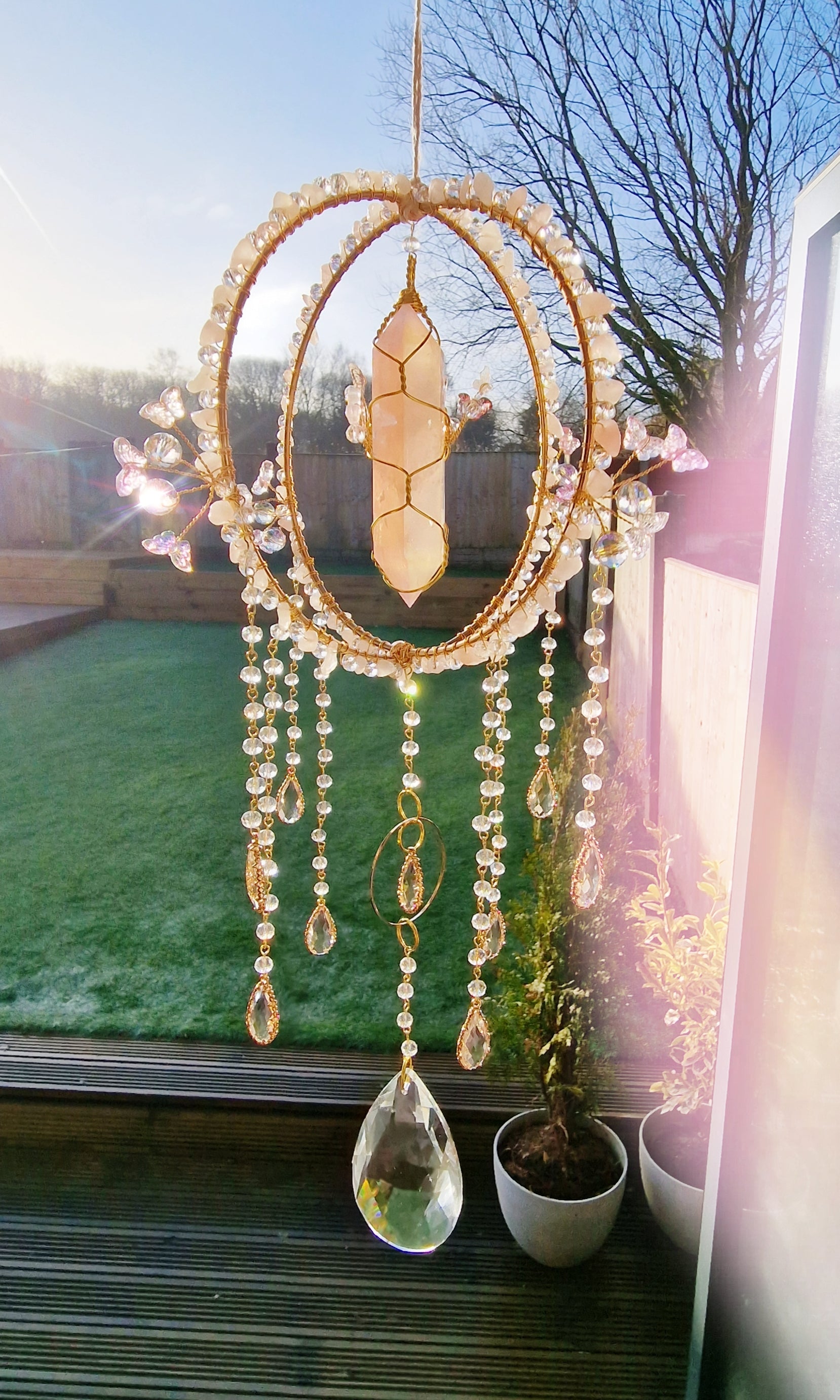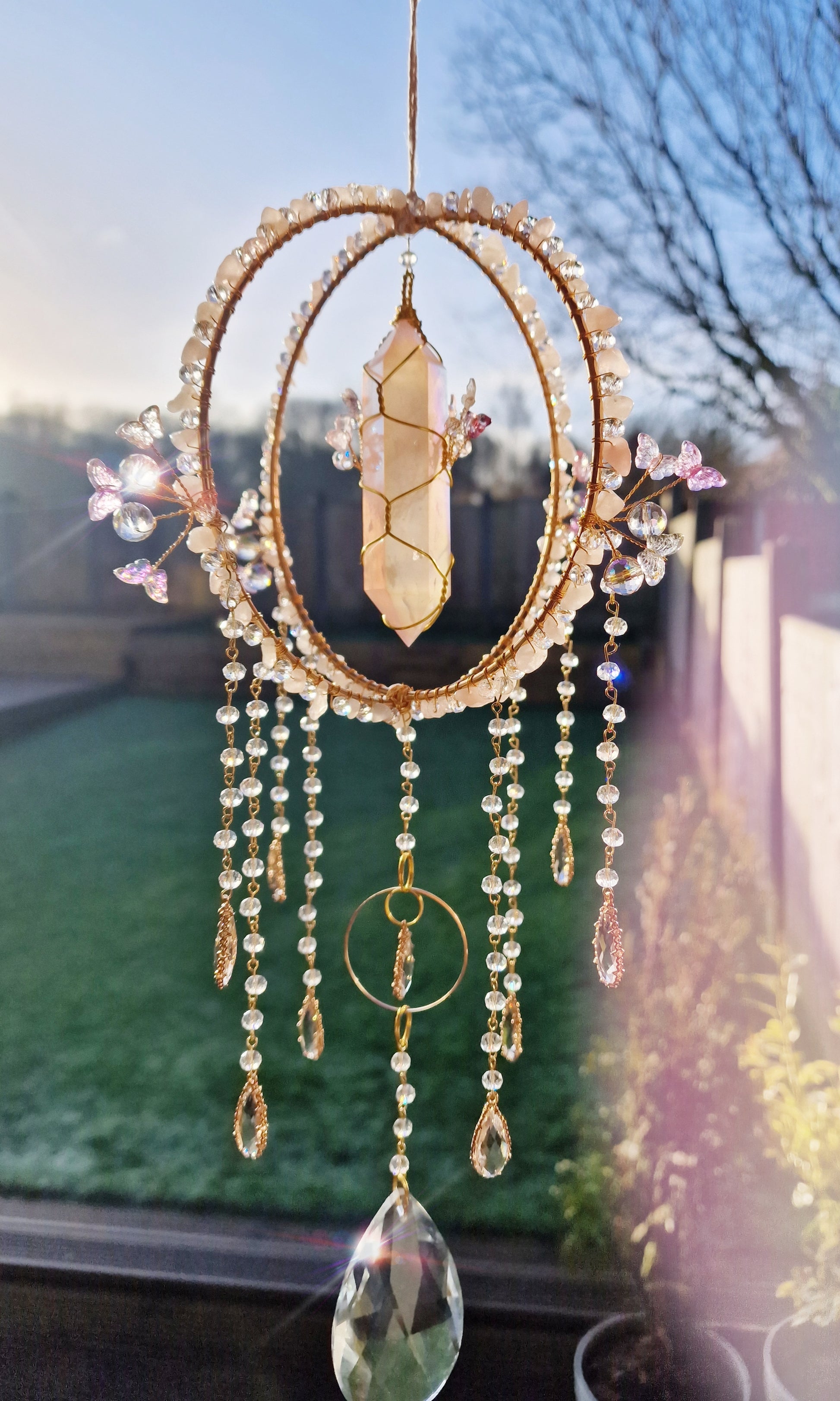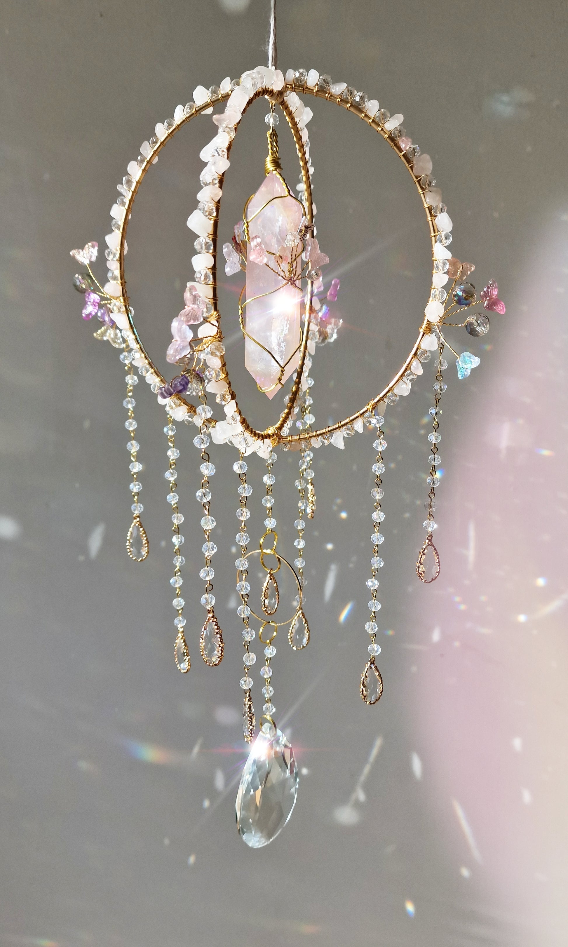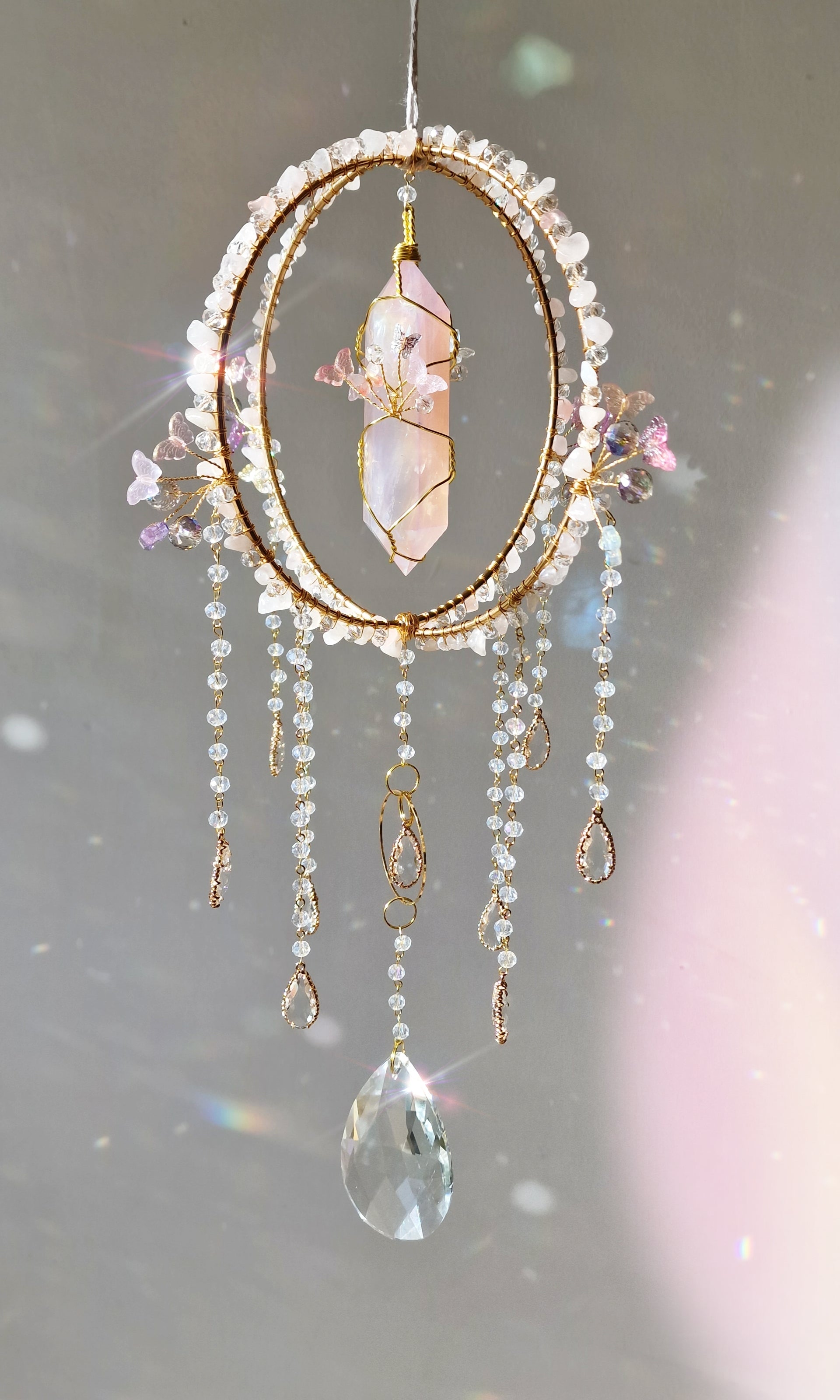 Invite love, harmony, and fairy magic into your space with this Butterfly Fairy Suncatcher! 🦋✨ Designed for fairy lovers, crystal collectors, and spiritual seekers, this handcrafted suncatcher features a gorgeous aura quartz double-pointed crystal, delicate butterfly charms, and soothing rose quartz chip beads.