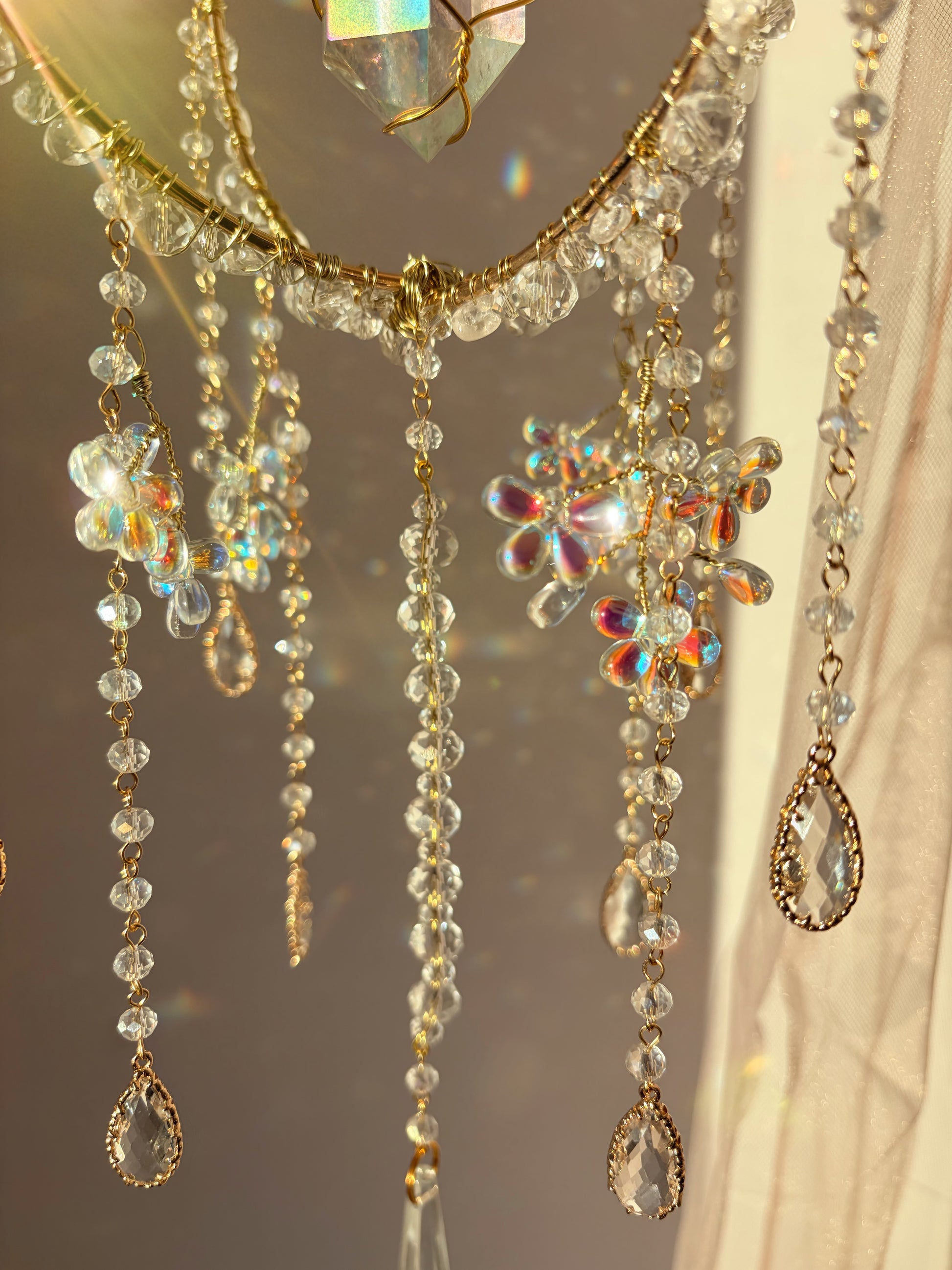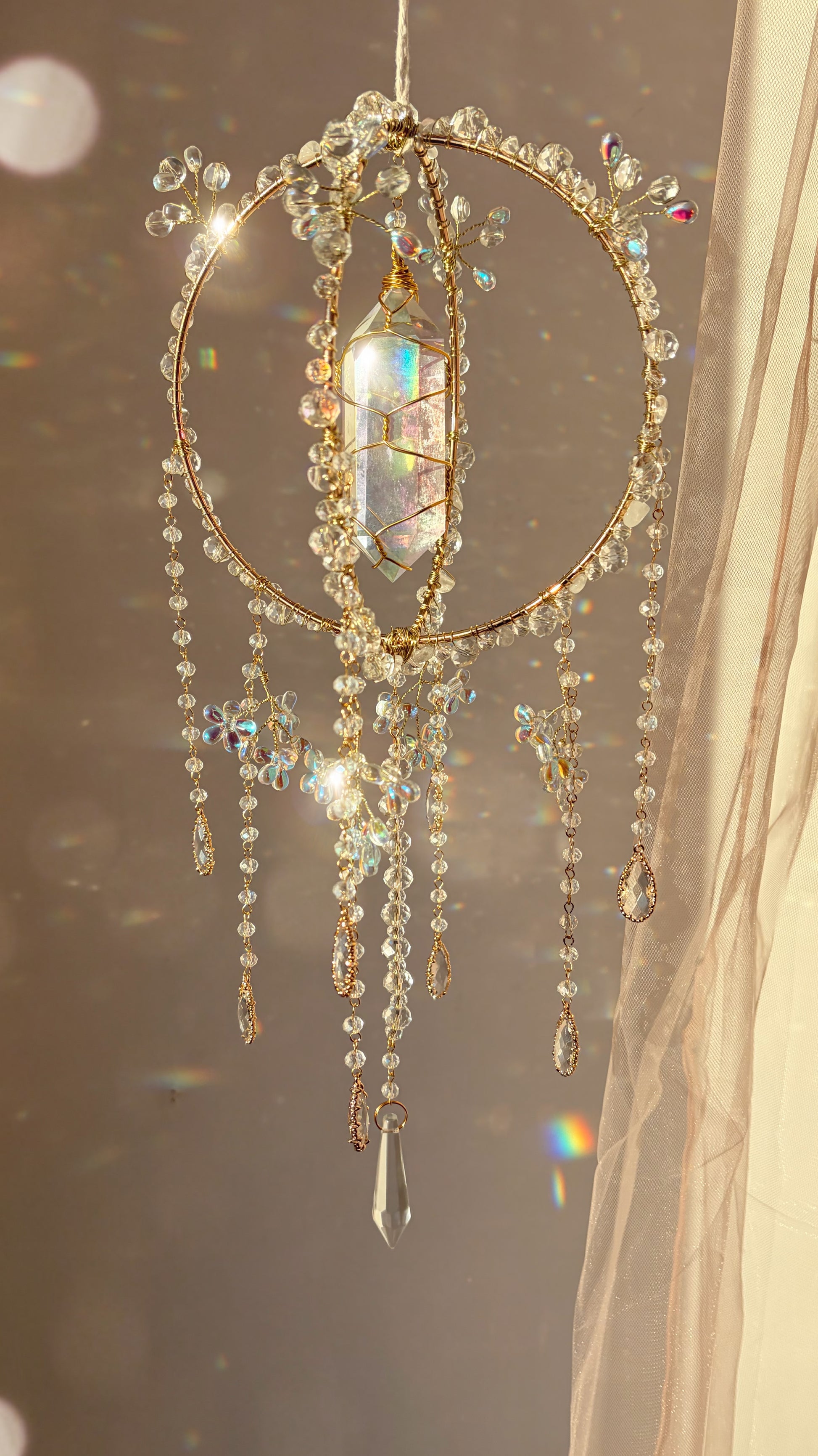 From my Enchanted Heart Collection, this one-of-a-kind suncatcher orb is filled with shimmering crystal chips and finished with a radiant aura double point that catches the light beautifully. Designed to sparkle in the sun and scatter tiny rainbows across your space, it’s a little piece of everyday magic crafted under starlight. Only one available ✨
