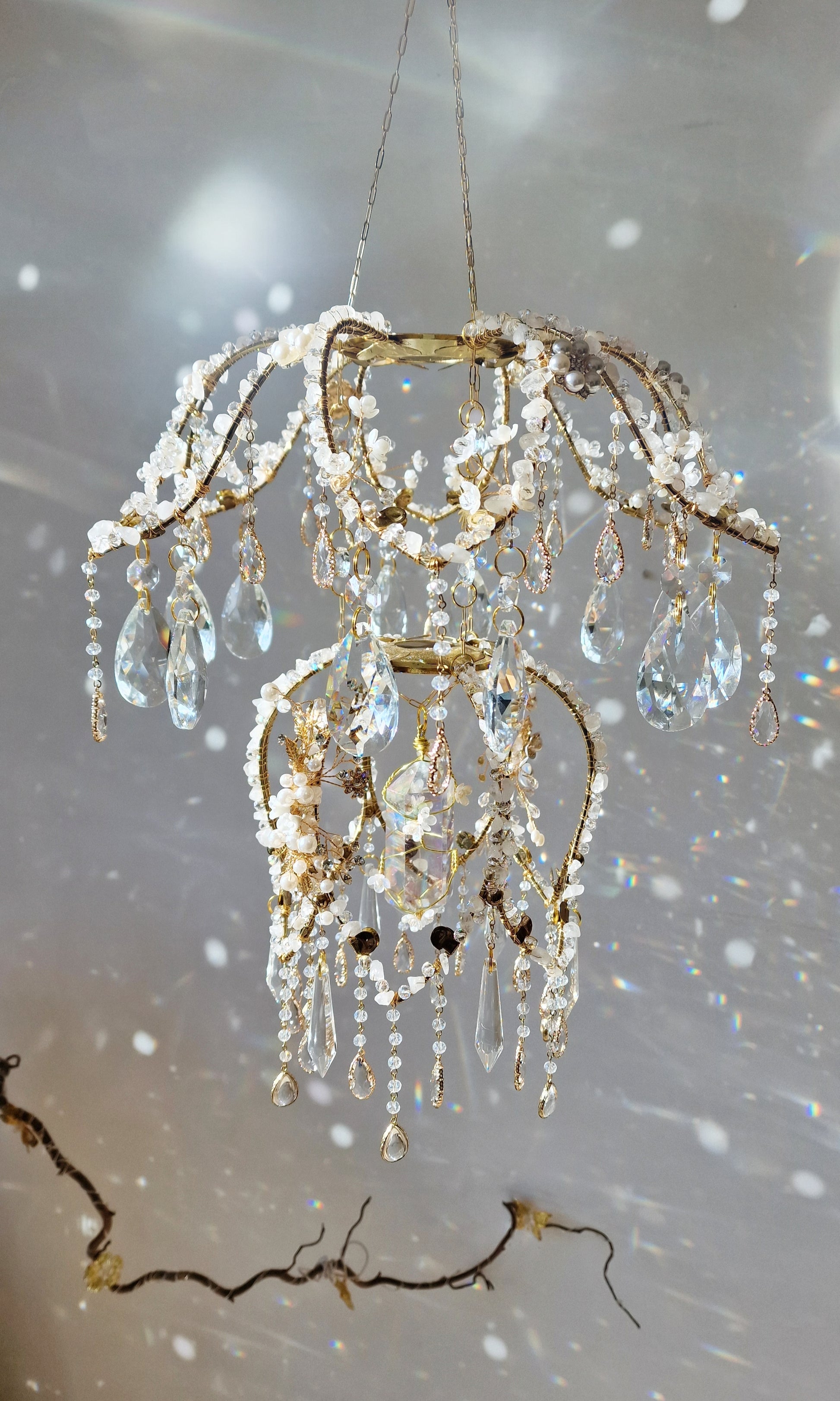 Flower crystal Suncatcher with rose quartz and aquamarine
